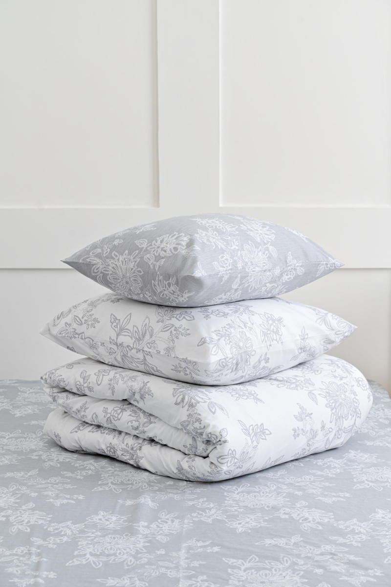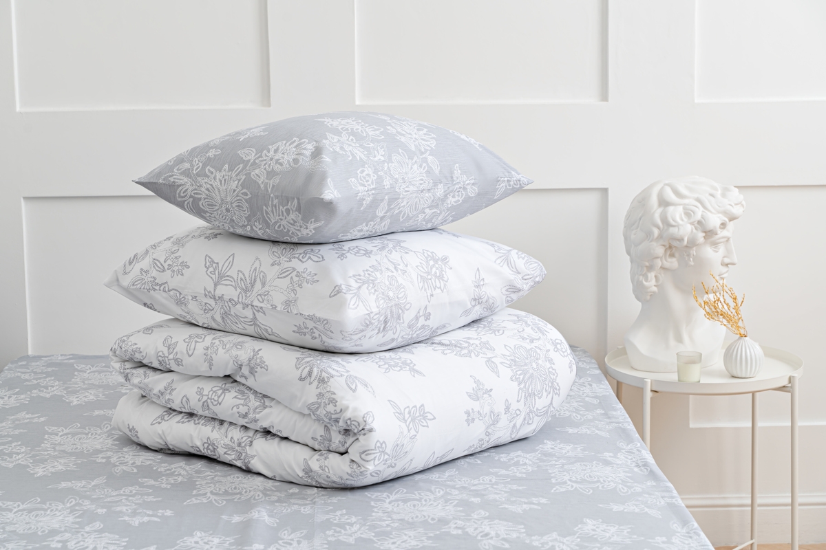 Постельное белье выполнено из сатина высокой плотности (пряжа 40х40) с пигментным окрашиванием. Ткань шелковистая, очень приятная на ощупь. Пододеяльник и наволочки сшиты из основной ткани, простынь и обратная сторона пододеяльника выполнены из ткани-компаньона.