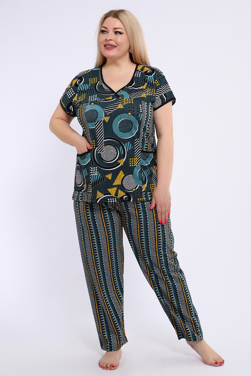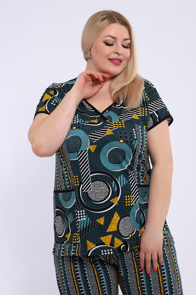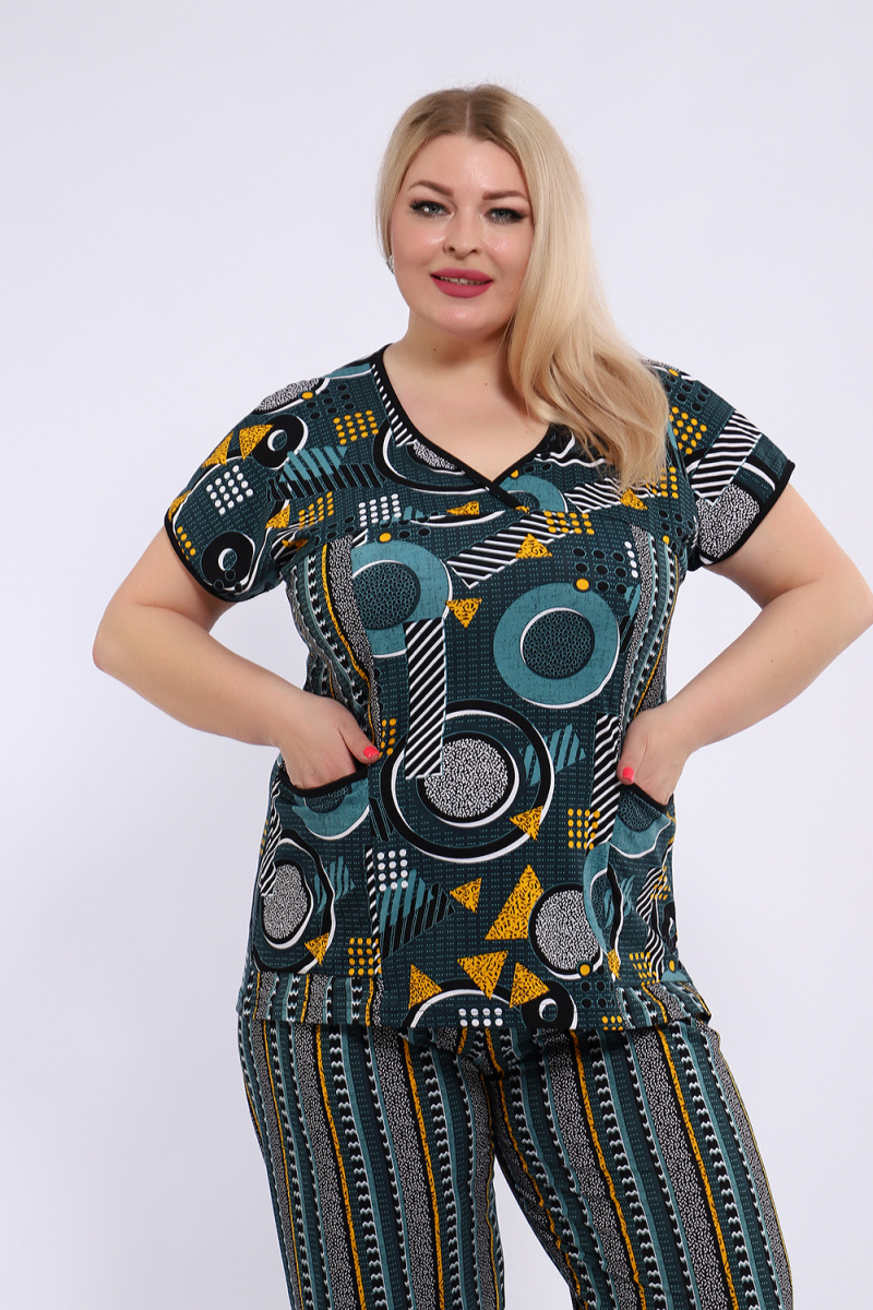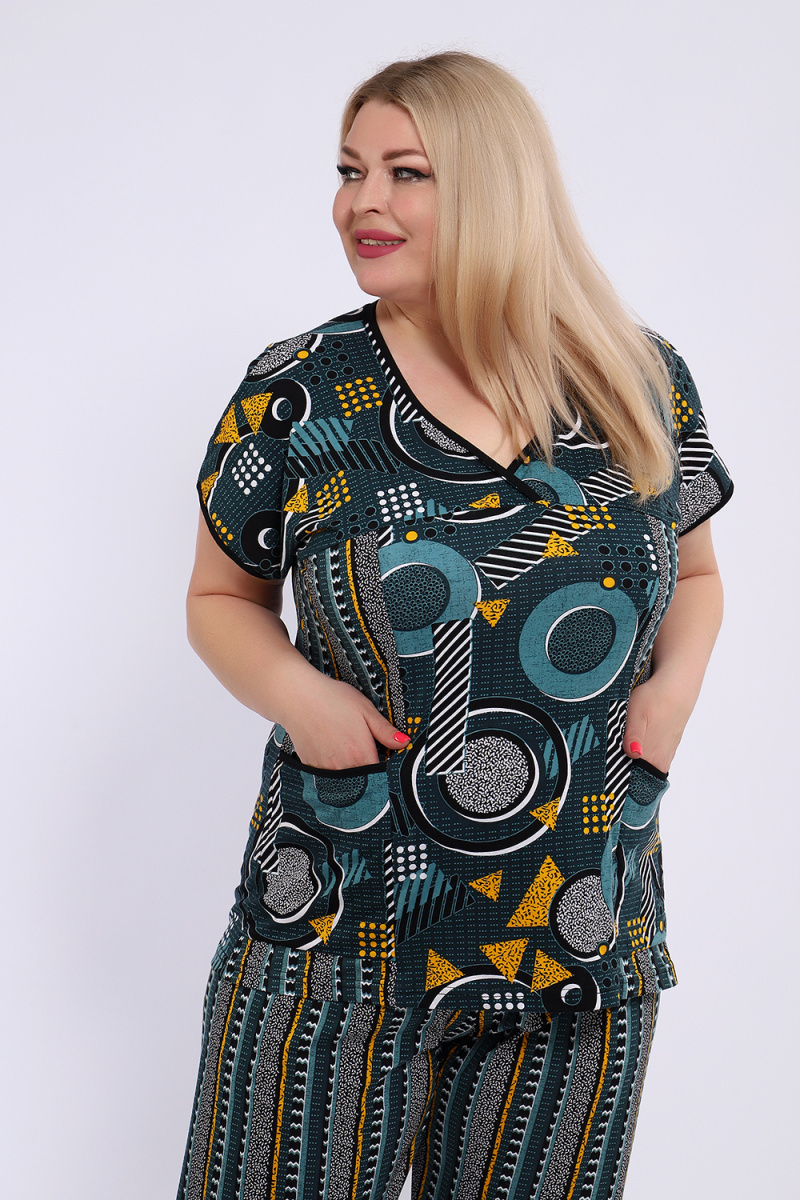 Костюм состоит из блузки и брюк. Брюки полной длины с притачной резинкой, низ изделия обработан швом в подгибку. Блузка со спущенной проймой, по бокам два функциональных кармана.