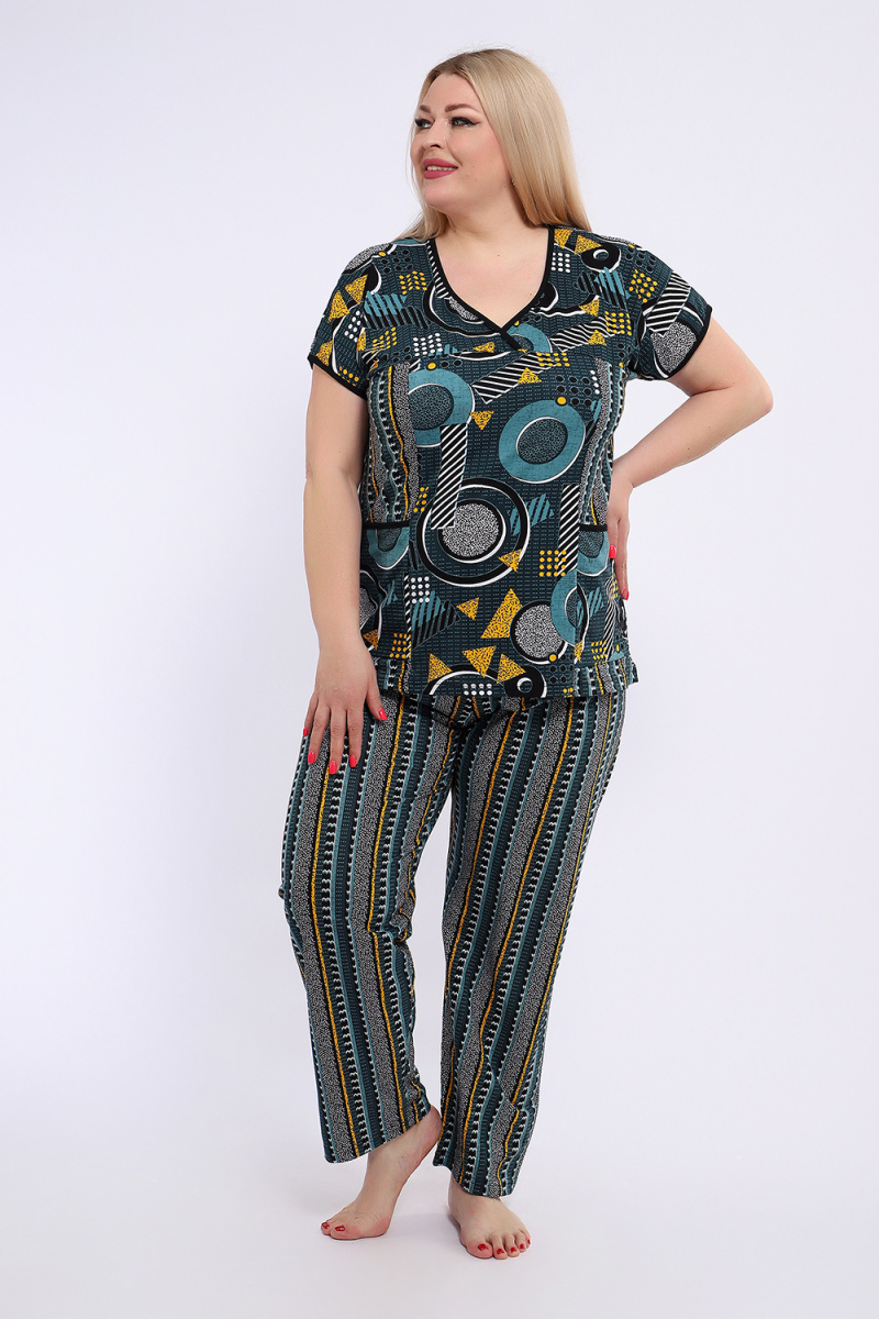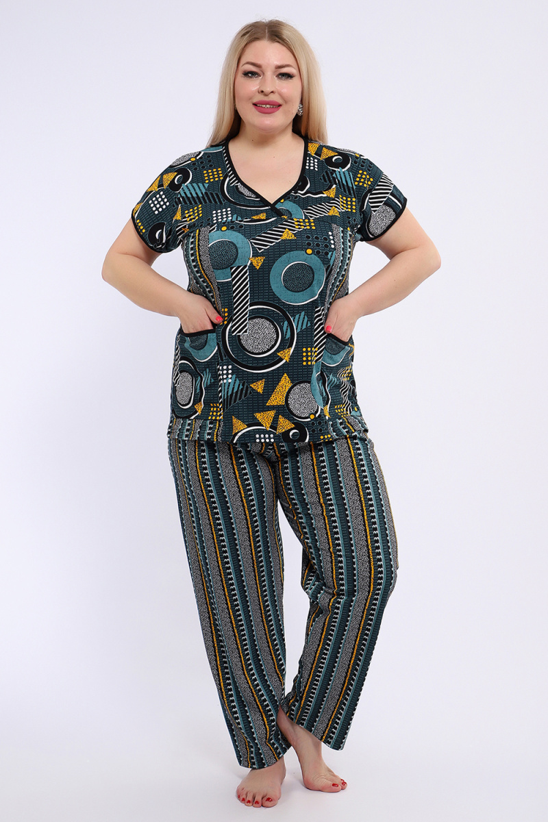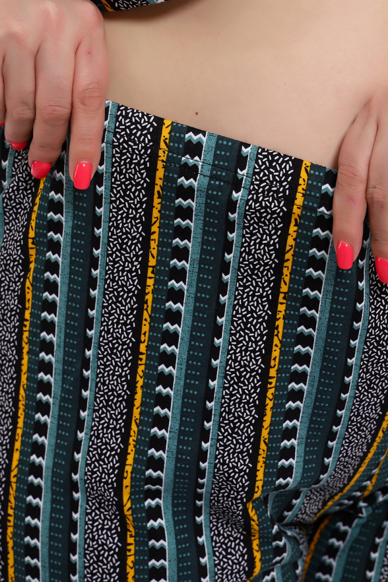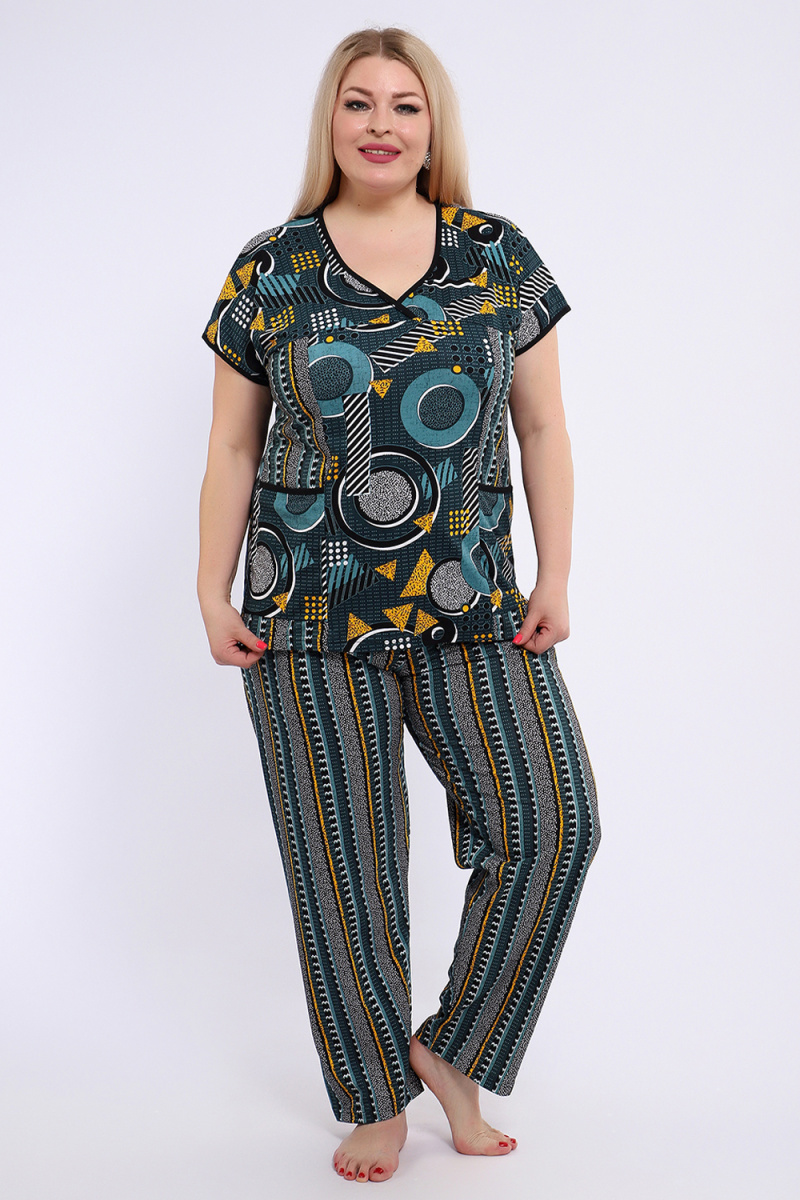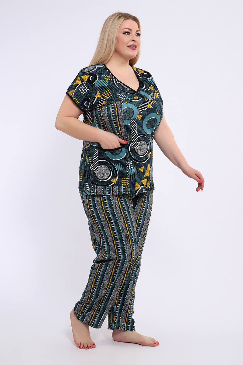Костюм состоит из блузки и брюк. Брюки полной длины с притачной резинкой, низ изделия обработан швом в подгибку. Блузка со спущенной проймой, по бокам два функциональных кармана.