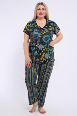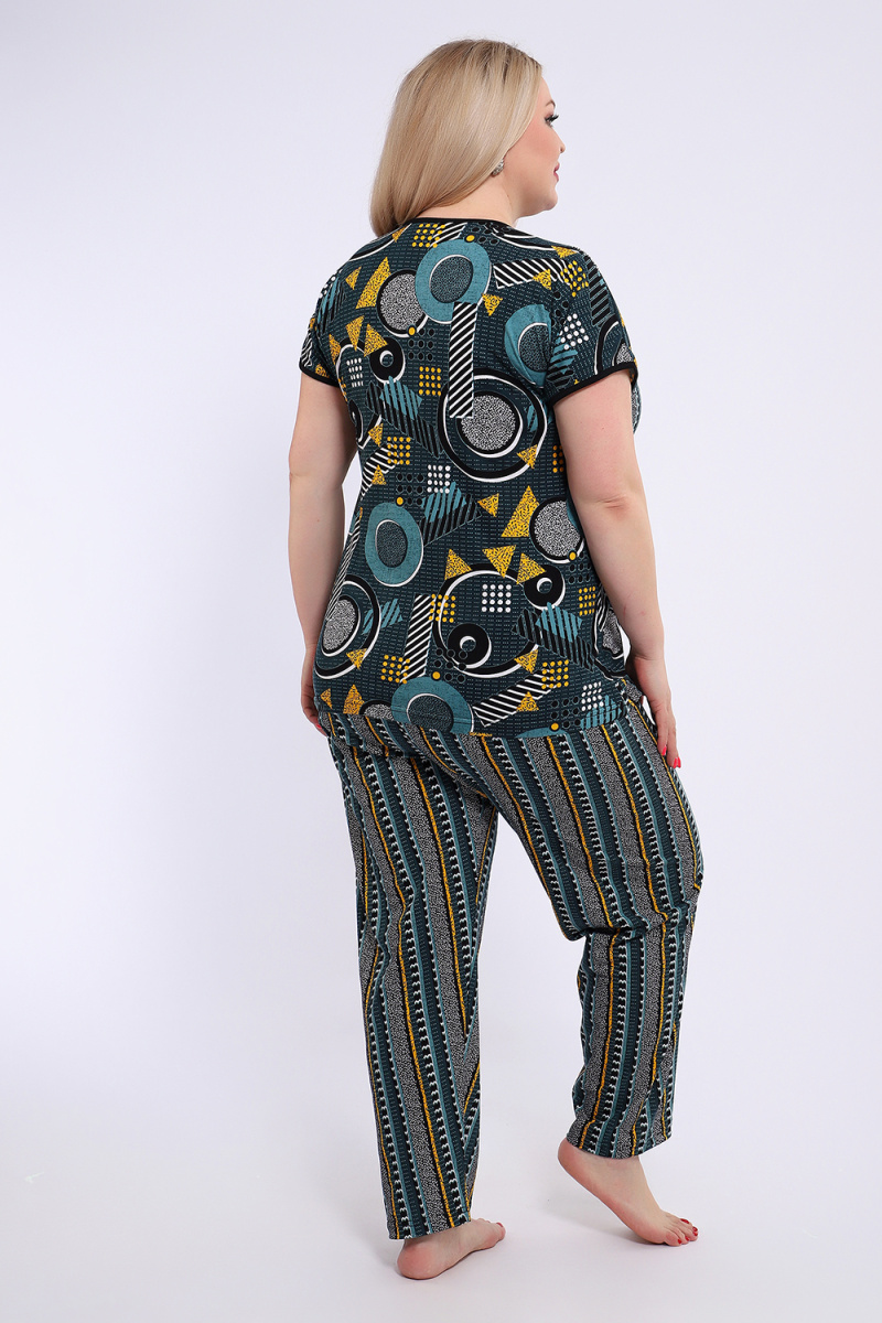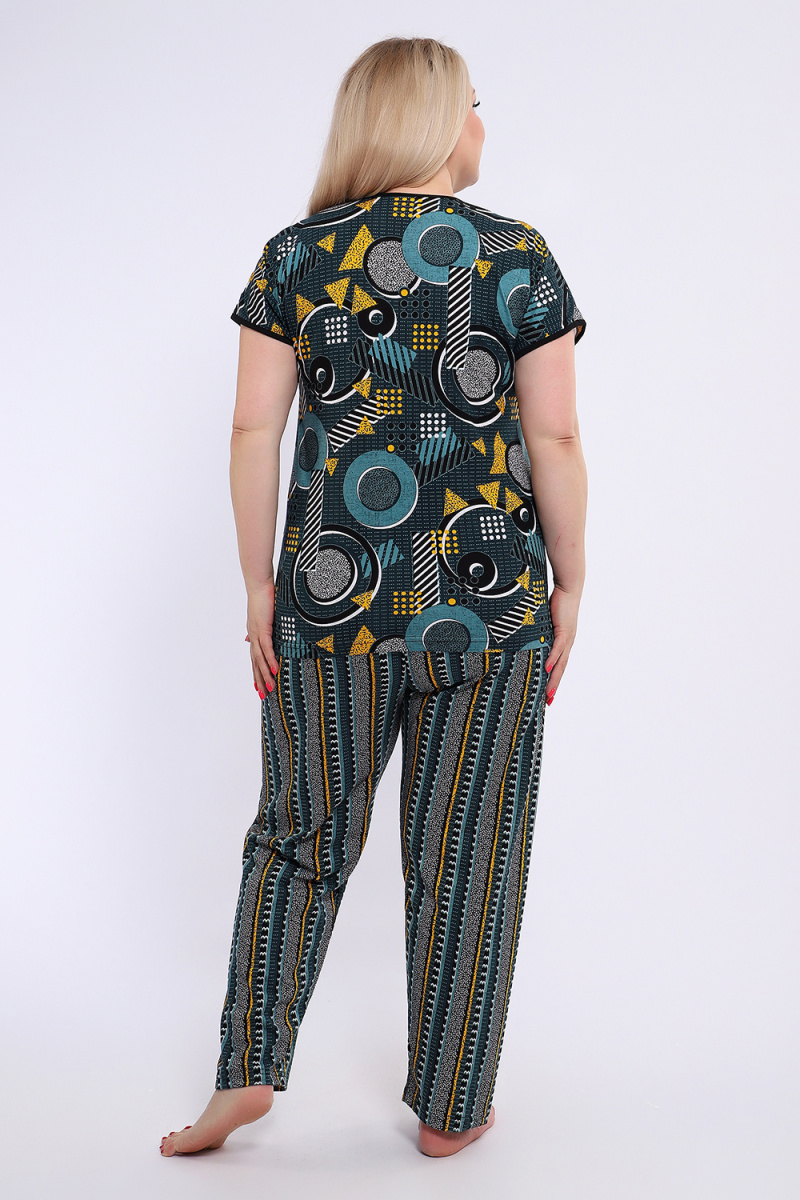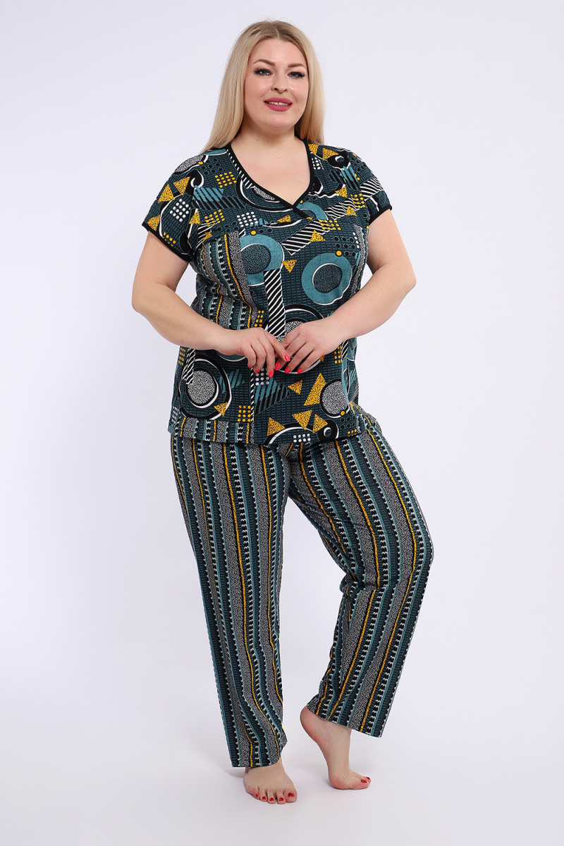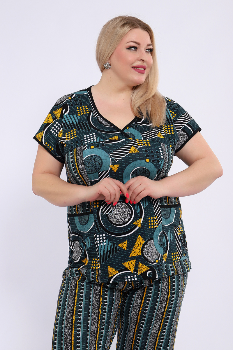 Костюм состоит из блузки и брюк. Брюки полной длины с притачной резинкой, низ изделия обработан швом в подгибку. Блузка со спущенной проймой, по бокам два функциональных кармана.