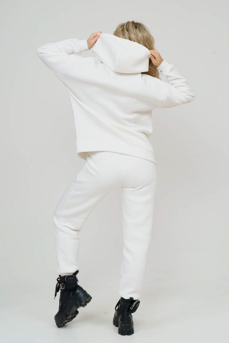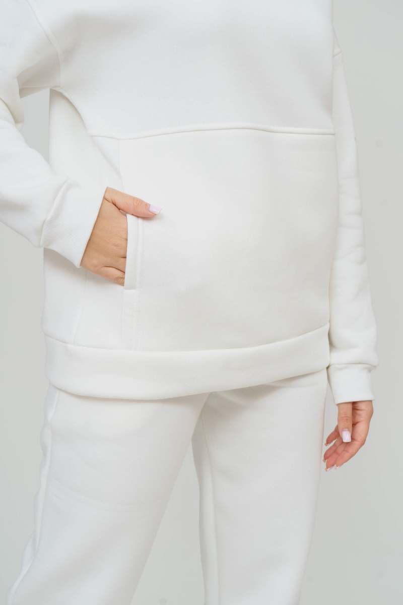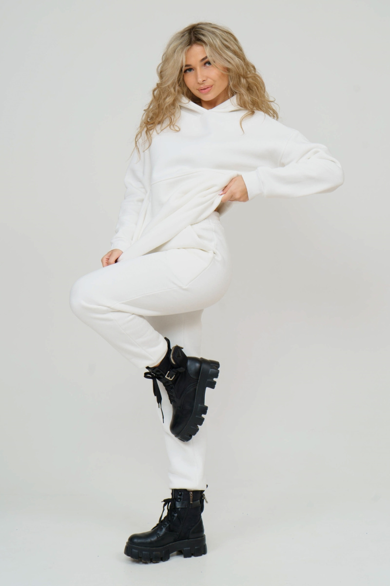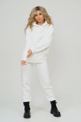 Костюм состоит из объёмной толстовки с капюшоном на запах и брюк с боковыми карманами. На полочке толстовки есть модный и удобный накладной карман. Манжеты рукавов и брюк выполнены из качественного кашкорсе. Линия плеча спущена. Длина рукава указана от точки основания шеи. Пояс брюк выполнен на специализированной поясной машине.
